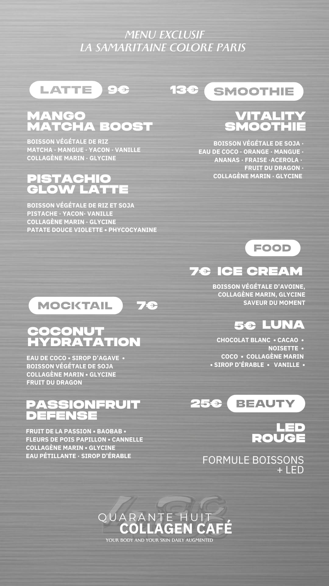 Come and take some time for yourself at Samaritaine with 48 Collagen Café! The brand creates drinks that are as delicious as comforting, rich in marine collagen sourced from responsible fishing in Europe. Ideal for the change of season, the concept was created by Amandine Fornot, whose holistic approach has won over many followers. Combining nutrition, aesthetic technologies and biohacking, 48 Collagen Café is setting up in the department store until the 8th of April! Its concept? An “enhanced” café where indulgence meets well-being. Smoothies, adaptogenic lattes, functional waters and other exclusives in Samaritaine yellow tones designed for the health of your skin will be available on the ground floor of the department store, alongside LED mask sessions and events.