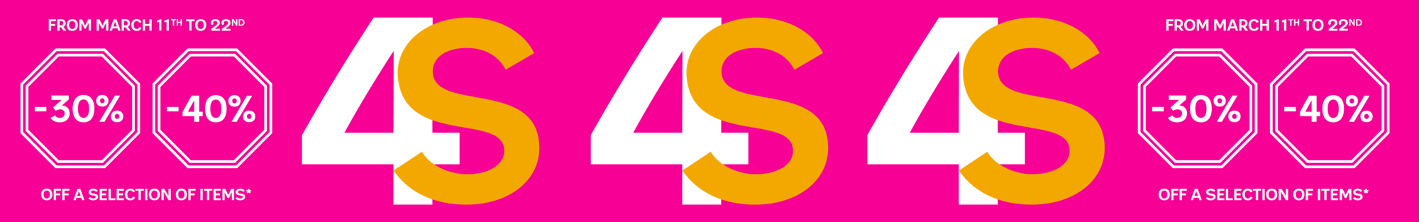 In a single brush stroke, the department is painting itself in the 4S colors! From March 11 to 22, enjoy 30% and 40% off a wide selection of fashion, watches, and jewelry. At beauty, get 20% off when you buy 2 products of the same brand**.